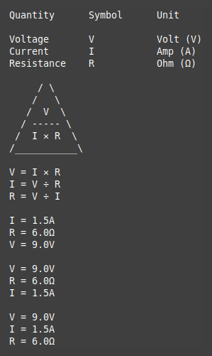 The formula triangle below represents Ohm's Law which describes the relationship between the three major quantities involved in the flow of electricity through a wire or other electrical/electronic component.