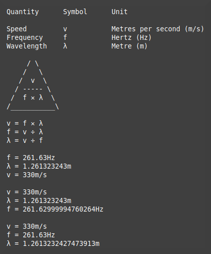 This example examines waves, and specifically sound waves. The same arithmetic applies to light waves which is a complex topic I'll look at in more detail in a future article. The three quantities used are: