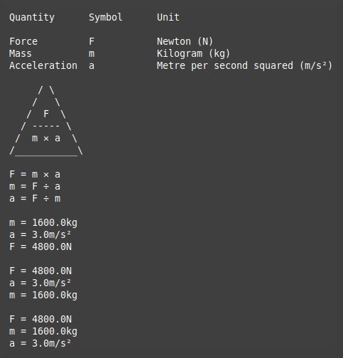 I've gone into more detail with the descriptions than with the other examples but what I have written would only be Chapter 1, page 1 of a long book on Newtonian Mechanics. Bear in mind that most of the time a body has two or more forces acting on it and it's necessary to calculate from them one single net force before working out how that force changes the body's velocity. In the formula triangle remember that F is the net force, often know as the resultant force as it's the result of combining several others.