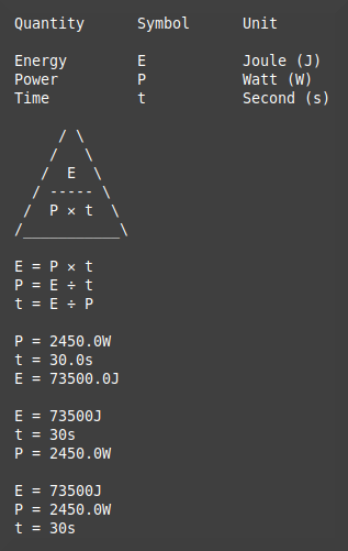 This is just one example of energy use, and the same formula triangle can be used for very different applications such as heating water. If you want to try this out you'll need to know that it takes 4,184J to heat 1kg (ie. 1 litre) by 1°C.