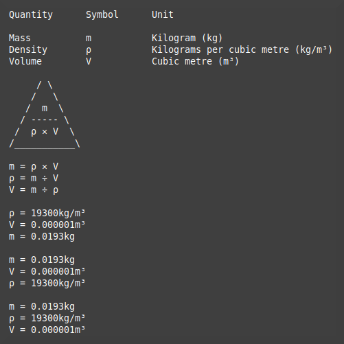 If you're wondering what "weighs" nearly 20t per cubic metre the answer is gold! The volume of 0.000001m³ is 1 cubic centimetre (cc). If you had 1cc of water then by definition it would have a mass of 1 gram but as you can see from the output a similar volume of gold has a mass of 0.0193kg or nearly 20g.