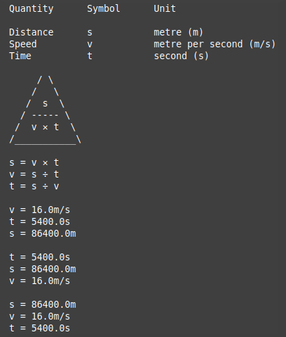 The core functionality here is in the distance_speed_time function which is called by main. The function first creates three Quantity tuples and passes them to the formula triangle module's output function.