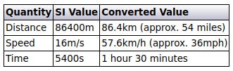 Using the SI system often leads to inconveniently sized values or unfamiliar units. The distance in metres can easily be converted to kilometres by shifting the decimal point three places to the left but it's not so easy to convert seconds or metres per second to familiar quantities. This table should help.