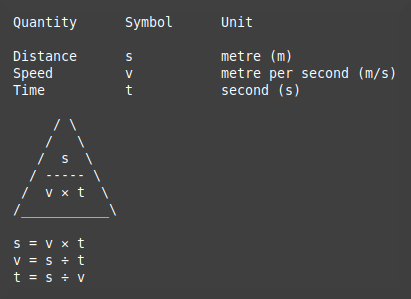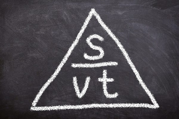 It's worth spending a bit of time verifying that the three formulas are actually equivalent. Starting with the first, s = v ✕ t, this shows how it can be rearranged into the second, v = s ÷ t.