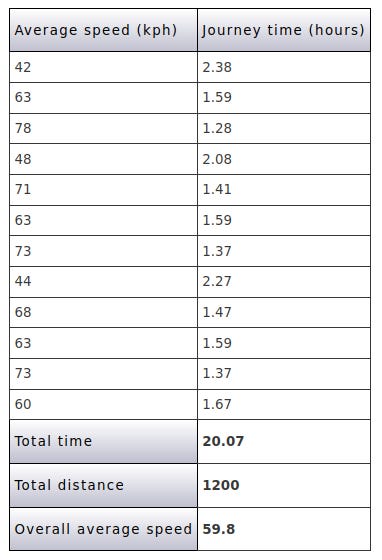 Now let's look at the reasons you might use the harmonic mean, using another example. Consider the following data which represent the average speeds and journey times of twelve 100km journeys.