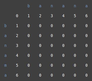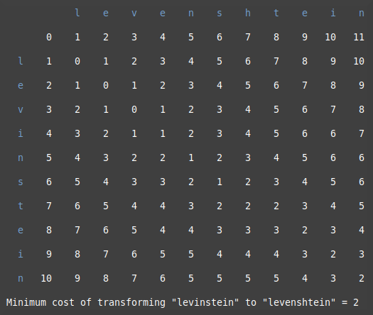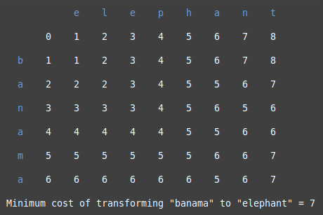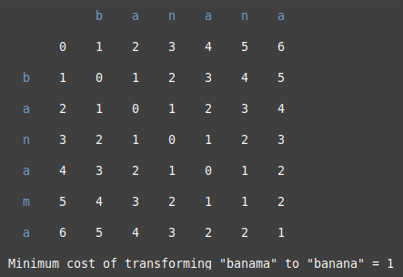Most values are initially set to 0, but the first row of numbers represent the cumulative number of letters which need to be inserted to form the target, and the first column shows the cumulative number of deletions to remove the source. In other words, to transform "banama" into "banana" you could delete six letters and insert six more. Obviously that's not the most efficient way though as only one operation needs to be done, the substitution of the "m" with an "n". Let's now look at the program output after the algorithm has been run.