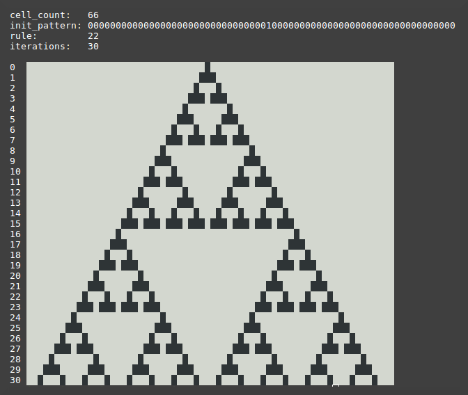 A 1D cellular automaton's states over time are usually represented by consecutive rows with the states represented by blocks of different colour. In this implementation I will write a simple console-based output, but the project is designed in a way which allows other UIs to be "plugged in". Some patterns produced can be much more interesting than others.