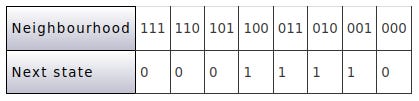 There are 8 possible neighbourhoods and therefore the rules for setting the next cell state can be represented by a byte. The decimal values 0-255 represented by all possible bytes form what is known as the Wolfram Code after Stephen Wolfram who carried out research in the area and wrote the book A New Kind of Science.