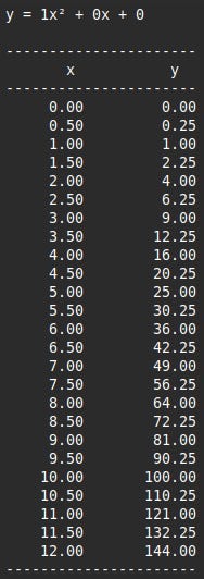 Firstly a heading for x and y values is printed with lines made up of the - character, followed by a for loop to iterate and print the values.
