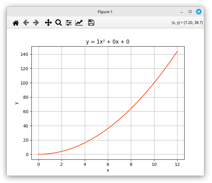 As well as calculating the areas of squares quadratic functions can be used to model a vast range of real world phenomena. Most of those won't fit neatly into a basic unmodified function such as that shown here and it will be necessary to stretch, squash and move the graph around. These tasks, more properly known as transforms and translations, are accomplished by using coefficient values other than the defaults set in __init__ and this topic will be covered in the next article.