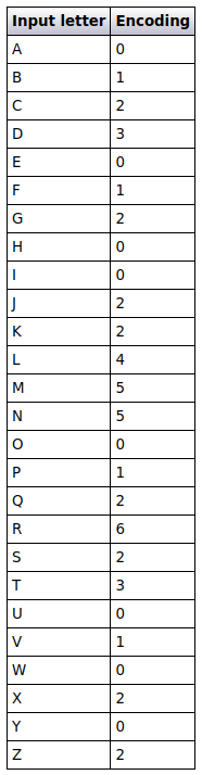 Finally, we need to check if we have not yet filled up the encoding list, which can happen if there are not enough encodable letters in the input string. If this is the case we simply fill in the empty values with 0s in a while loop.
