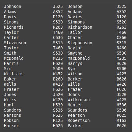 As you can see the algorithm is not perfect. Even with this small selection of names a few problems are apparent. Ignoring repeating values means Simons and Simmons are given the same encoding, and using only the first few letters means Richards and Richardson are also encoded the same. Ignoring vowels means that Wells and Wills, Sanders and Saunders, Parsons and Pearson are all given the same encodings despite not actually being homophones.
