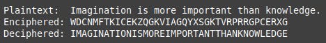 To encipher a string of text you need a keyword. This can be anything but ideally should be of a reasonable length. For this example I will use "Imagination is more important than knowledge." as plaintext and "orchestra" as a keyword.