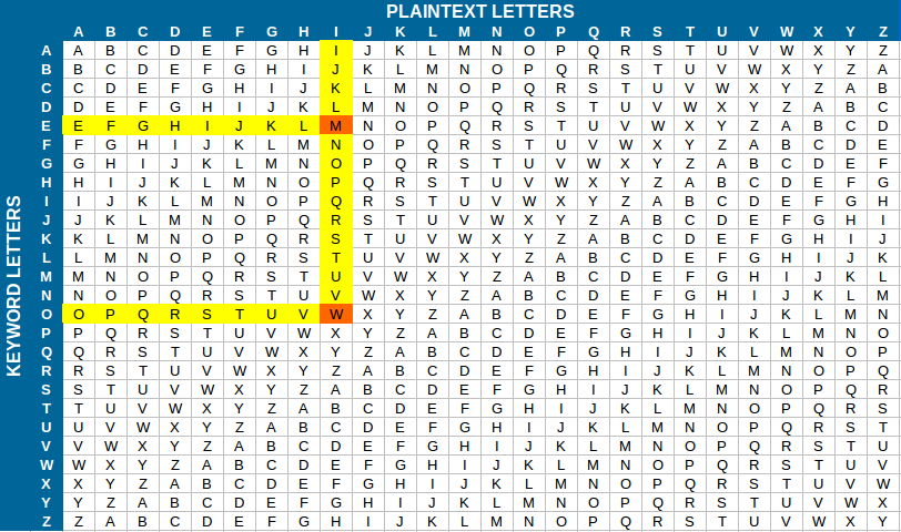 For example, the first letter of the plaintext is I and its keyword letter is O, and they intersect at W. The second I is paired with E, so is enciphered as M. The entire plaintext is enciphered as: