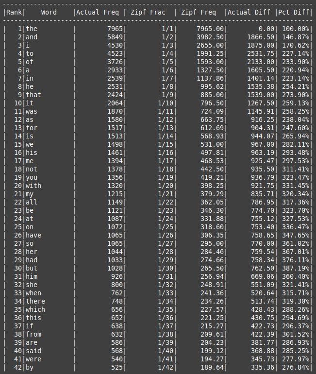 main()After some very mundate code to read a text file we pass it to generate_zipf_table and then pass the result to print_zipf_table.